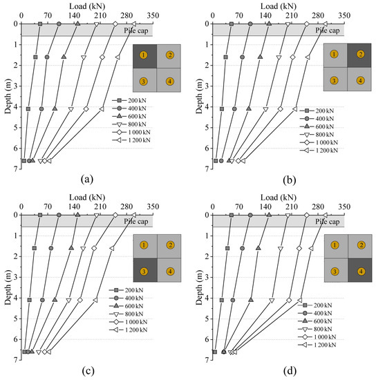 Pile axial force distribution curve: (a) foundation pile 1; (b) foundation pile 2; (c) foundation pile 3; (d) foundation pile 4.