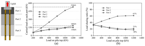 Considering the load distribution among different sections of the piles and plotting the load distribution curve, as shown in Figure 11, it becomes evident that when a load of 200 kN is applied at the pile head, the three sections of the piles generally share the load equally. As the load at the pile head increases, the load distribution among these sections also increases. Notably, Part 3, situated at the lower part of the piles, experiences a more significant increase in load distribution. This is attributed to the fact that the top load gradually transfers to this section. Furthermore, due to the higher compressive modulus (greater stiffness) of the lower soil, the ratio of compressive modulus Eb to Es between the lower soil and the soil around the pile (Eb/Es) is relatively small. This results in the accumulation of lateral frictional resistance along this portion of the pile [36]. Consequently, this section experiences the most significant increase in load distribution, reaching 530 kN at the ultimate load. Its load distribution accounts for 61% of the ultimate uplift capacity of the entire micropile group. In contrast, Part 1 and Part 2 share a relatively similar load distribution, with load distributions of 150 kN and 185 kN, respectively, at ultimate load. Their load distributions represent 18% and 21%, respectively, of the total capacity. This indicates that when the micropile group is subjected to uplift loads alone, the contribution of the pile cap is not significant, and it does not substantially enhance the uplift capacity of the foundation.