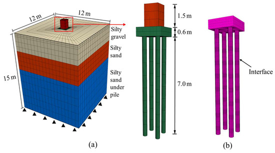Taking into account the influence of pile length and the effect of the pile cap, the geotechnical soil extends 6.6 times the length of the pile cap in both the x and y directions, and 2 times the length of the pile in the z direction. The model dimensions are 12 × 12 × 15 m. The constitutive model for the soil adopts the Mohr–Coulomb model, which includes non-associated flow criteria. The pile’s constitutive behavior is modeled using an isotropic elastic–plastic model. Both the soil and pile are simulated using solid finite elements, and their interaction is represented by establishing interface elements between the soil and the pile foundation [37]. Normal displacement constraints are applied on the model’s lateral sides, fixed constraints are applied at the bottom, and the model’s top surface is considered a free surface. Due to the low groundwater level at the test site, the influence of groundwater is not considered during the simulation. To balance computational efficiency and accuracy, the mesh is refined more extensively in the pile–soil contact region and becomes relatively coarser when further away from this area, with an increment space geometric ratio set to 1.2.
