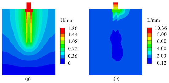 Displacement cloud of numerical inversion: (a) carried uplift load displacement cloud map; (b) carried horizontal load displacement cloud map.