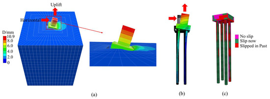 Numerical simulation effect under combined load (uplift and horizontal load ratio = 2:1): (a) soil deformation enlarged cloud diagram; (b) micropile group foundation deformation enlarged cloud diagram; (c) sliding cloud diagram of contact surface.