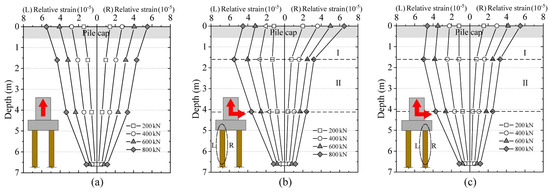 The relative strain distribution curve of the left and right side of the pile body: (a) H = 0; (b) the left foundation pile with H = 1/2 U; (c) the right foundation pile with H = 1/2 U. Note: The strain influence region of the pile is divided into two zones, designated as Zone I and Zone II.