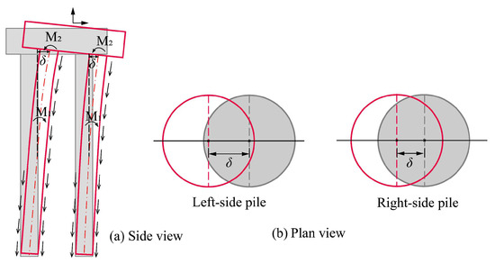 - Under the combined load–coupling effect, the additional moment M1 generated by the unbalanced lateral friction resistance on both sides of the pile cross-section is greater than the additional moment M2 generated by the P–Δ effect. As a result, the relative displacements and lateral friction resistance on the left and right sides of the upper part of the foundation are different from those under individual uplift loading conditions, and the piles located farther from the soil under compression exhibit larger net bending moments.