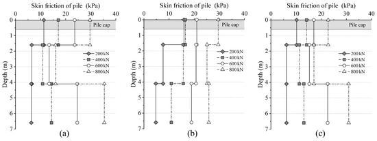 As the load increases, the lateral resistance on the upper part of the pile decreases, and the lower lateral friction resistance gradually comes into play to counterbalance the top load until reaching the ultimate state. This indicates that the transfer of lateral friction resistance increases gradually from top to bottom. As shown in Figure 10, at the ultimate load, Part 3 exhibits the highest average lateral friction resistance (45–63 kPa), followed by Part 1 with a slightly lower average lateral friction resistance (21–33 kPa), and Part 2 shows the lowest average lateral friction resistance (11–16 kPa).
