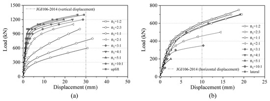 Load–displacement curves of micropile group foundation with different load ratios: (a) uplift load−displacement curve; (b) horizontal load−displacement curve.