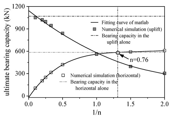 As shown in Figure 19, under the influence of horizontal loads, the uplift capacity of the micropile group gradually decreases with the reduction in the ratio of uplift-to-horizontal-load application. This indicates a noticeable weakening effect of applying horizontal loads on the uplift bearing capacity of the pile group under similar soil conditions. This finding aligns with the conclusions drawn by Sharma and Buragohain [23] from indoor model experiments when subjecting micropile groups to loads at different angles. Under the influence of uplift loads, when the ratio (n) is 0.76, the horizontal bearing capacity of the micropile group is similar to that of applying horizontal load alone, but when n is greater than this value, the horizontal bearing capacity of the micropile group is weakened. On the other hand, when n is less than this value, with the decrease in the proportion of uplift load, the horizontal ultimate bearing capacity of the micropile group slowly increases and gradually stabilizes. At this point, the uplift load has a positive effect on the horizontal bearing capacity. Based on Table 4, it can be observed that when n ≥ 3, relative sliding occurs between the pile and soil, and the uplift bearing capacity reaches its limit first, while the horizontal load is relatively small and does not meet the failure criterion. When 3 > n ≥ 1, the load–displacement curve exhibits a “steep transition” type, with a larger proportion of horizontal load, and the pile foundation undergoes horizontal failure first. When n < 1, both the uplift and horizontal bearing capacities of the micropile group are enhanced. However, due to the relatively small increase in horizontal bearing capacity, the uplift bearing capacity is not fully exploited. At this point, the overall bearing capacity of the micropile group is still determined by the horizontal bearing capacity.