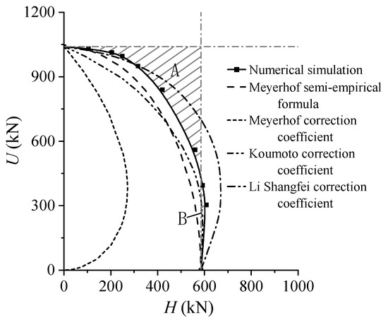Figure 21 shows the load-yield envelope of the micro pile group foundation under the U–H load plane, where all the yield points are connected. Regression analysis of the experimental data reveals that the horizontal and vertical bearing capacities under combined loading exhibit an approximate 1/4 elliptical relationship. A comparison with previous studies [40,41,42] indicates that the U–H bearing capacity envelope obtained in this study is relatively close to the Koumoto empirical formula results. However, there are still certain deviations between them when the horizontal load is relatively small. Therefore, for the pile foundation under combined loading, the relationship between the horizontal and vertical loads is not exactly the same. Factors such as pile structure, geological conditions, and loading sequence should be thoroughly considered to establish corresponding criteria for assessment.