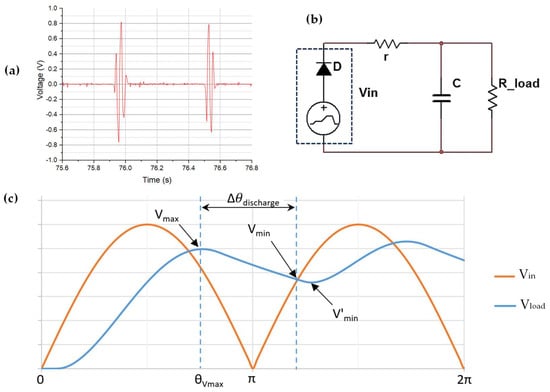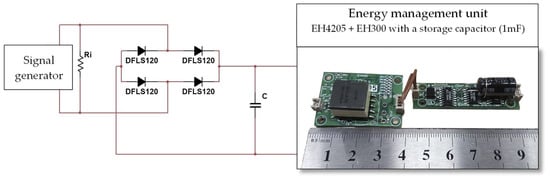 22]. By considering these parameters, a detailed analysis of characteristics including peak, average, or root-mean-square (RMS) current can be conducted. In the context of a full-wave rectifier circuit, where considerations include losses apart from the load, it is observed that increasing the smoothing capacity leads to a reduction in rectified voltage ripple (the difference between the highest and lowest voltage levels) and an increase in the mean value. However, the presence of losses imposes limitations on how high the rectified voltage can be relative to the input signal. These losses can originate from various sources but mainly are conduction losses in the diodes and resistive losses in the energy harvesters themselves, as the latter can exhibit relatively high internal resistance [