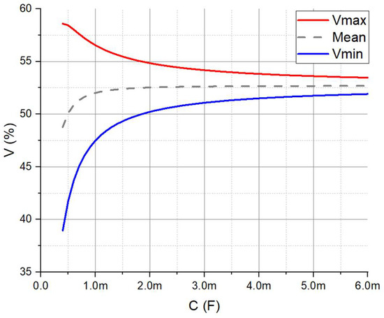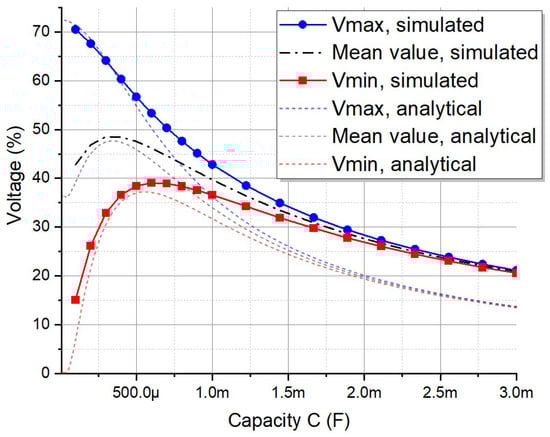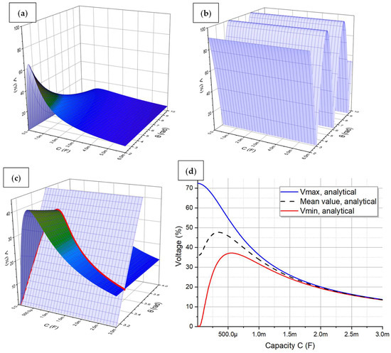 Vmin exhibits a non-linear relationship with the smoothing capacity, featuring a prominent peak value between the first two input signal pulses just above 500 µF. For more comprehensive evaluation, the intersection can be extracted as a projection and plotted on a 2D graph along with Equation (3) for
