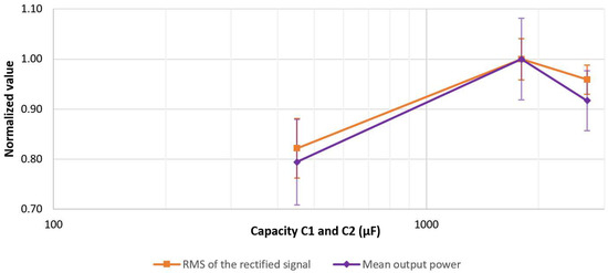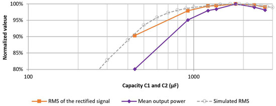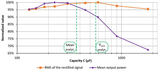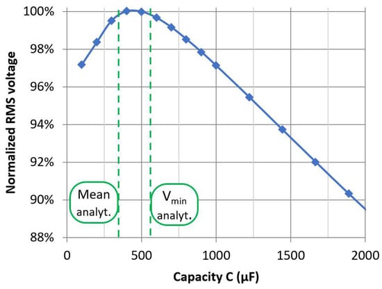 By evaluating the RMS value of the whole rectified signal, the obtained relationship indicated the peak value at the smoothing capacity between the predicted mean and the lowest voltage peak (see