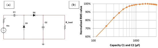 31], and this state lies beyond the scope of the models mentioned. Therefore, the main objective of this study was to investigate the influence of the smoothing capacitor value on a rectifier’s output when dealing with circuits with additional losses and intermittent input signals. Two rectification schemes were investigated: a full-bridge rectifier, for which an analytical model was proposed, and a voltage doubler, which was simulated using computer models. The rest of the paper is structured as follows.