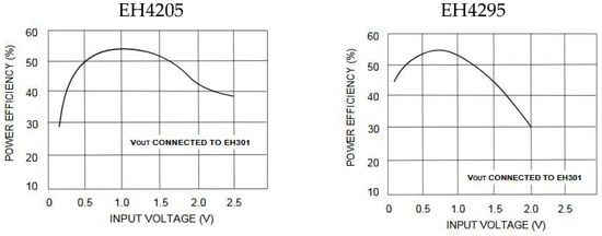 Vmax had notably increased according to the model, and the converter was able to harness the advantages of higher peaks. This, in turn, yielded a higher performance benefit due to the steep efficiency curve with respect to the input voltage. In contrast, the voltage-doubler experiment exhibited an RMS value as high as 470 mV, representing a more stable efficiency region on the curve (