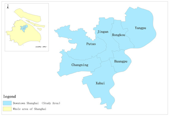 When selecting the study area, it is necessary to consider the specific usage of shared bicycles in the area. It requires a relatively stable state regarding the number of shared bicycle users and cycling behavior. Shanghai is one of the four municipalities directly under the central government in China, and it is also the center of our economy, culture, trade, science, and technology. It has a superior geographical location and dense population, and is perfectly developed. Shared bicycles are developing well in Shanghai; the number of daily active vehicles of shared bicycles is stable at 450,000 to 550,000, the daily turnover rate of bicycles is about 5.0 times, and the user’s riding behavior is stable. Therefore, this paper selects downtown Shanghai as the study area based on this condition, as shown in Figure 1. The research area includes seven significant districts, Yangpu District, Putuo District, Hongkou District, Jingan District, Changning District, Xuhui District, and Huangpu District, with about 266 and more than 7 million people by 2020.