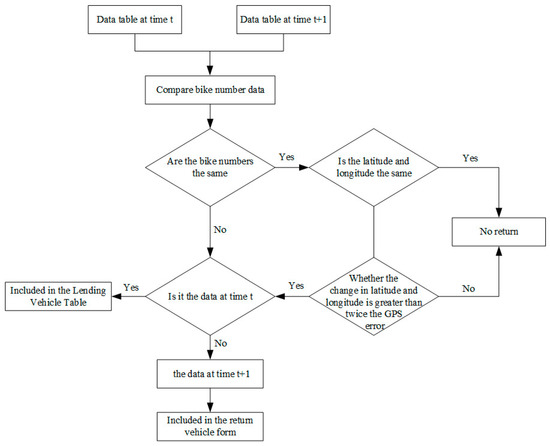 This paper obtained 8,453,497 shared bicycle riding records within a week in downtown Shanghai, including bicycle ID, time information, and longitude and latitude information. The steps required to convert the GPS data of shared bicycles into borrowing and returning quantity data include the following: 1. Calculate the GPS data of the shared bicycles’ parking position into a data table according to the time information; 2. Compare the bicycle IDs in the two adjacent time tables of t, using t + 1 to eliminate data with the same ID. If data with a different ID exist in the statistical area at time t but are not in the statistical area at time t + 1, the bicycle was being borrowed; otherwise, the bicycle was being returned; 3. Compare the longitude and latitude information of the data with the same ID. If the longitude and latitude of the bicycle change during the period (t, t + 1), it is the case that the bicycle that has been used. The data at time t are included in the bicycle borrowing statistics table, and the data at time t + 1 are included in the bicycle returning statistics table. The specific operation process is shown in Figure 2.