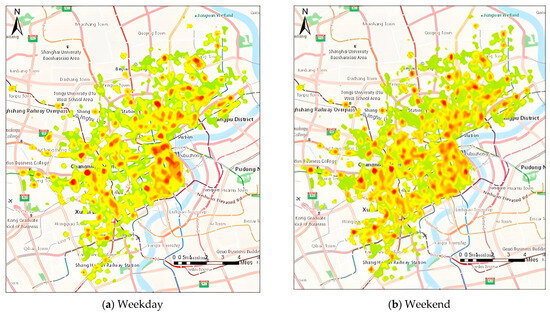 As shown in Figure 3, the shared bicycles in downtown Shanghai on weekdays and weekends are relatively similar in spatial distribution and present an aggregation state. From the perspective of administrative divisions, the areas with higher shared bicycle density are Yangpu District, Huangpu District, Putuo District, and Hongkou District. At the street level, shared bicycles are concentrated in public transport stations, shopping areas, office buildings, education institutions, catering, and other service industries, as well as locations with high road accessibility.