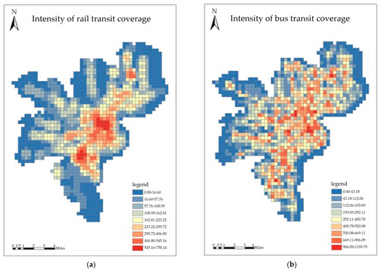 where and , respectively, indicate the coverage of rail transit stations and bus stations.