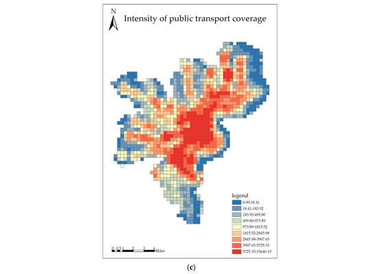 According to relevant surveys, 69% of shared bicycle trips in Shanghai are designed to connect with public transport. Therefore, the intensity of public transport coverage has an important impact on the distribution of shared bicycles. Since the grid cell scale is small, only the grid cell at the station’s location will be assigned by simply using the number of public transport stations, which is inconsistent with the actual situation. The parameter of public transportation coverage intensity is introduced in the study to characterize the spatial grid unit’s convenience of public transportation connection.