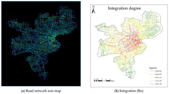 The influence of road network conditions on the distribution of shared bicycles essentially reflects spatial accessibility on travel choices. This paper uses the index of Space Syntax to reflect spatial accessibility. Space Syntax is a theory and method of urban spatial analysis proposed by Bill Hillier in the 1980s [28]. It essentially divides space while following the principle of graph theory, specifically abstract urban space, into intersecting line segments. Formulas have been put forward to quantify the topological relationship between line segments, explore the internal laws of spatial structure, and reveal the relationship between human activities and spatial structure [29].