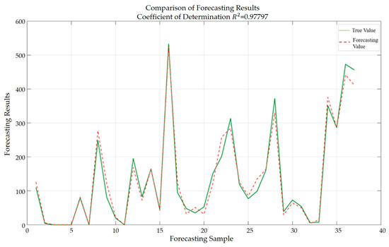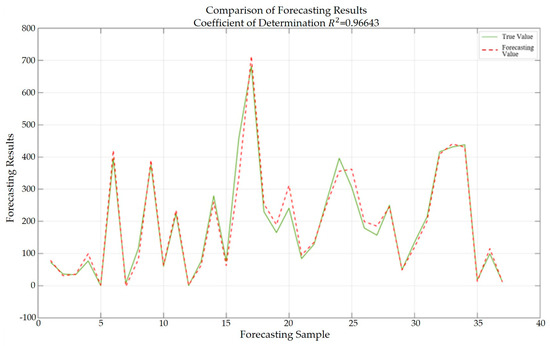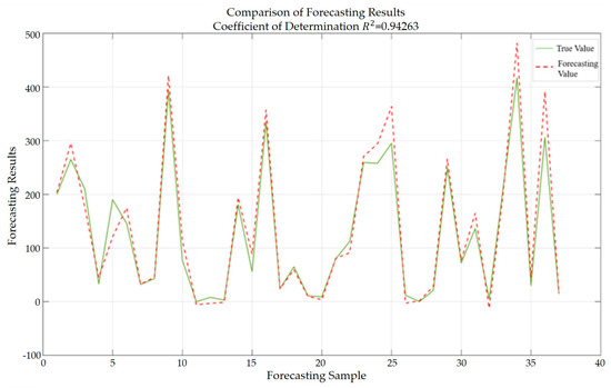After assigning the research data to the grid, the correlation analysis results show that the POI comprehensive index, the intensity of public transport coverage, and spatial accessibility significantly impact the spatial distribution of shared bicycles. The Linear kernel function, Gaussian radial basis function, and Polynomial kernel function are used to construct the SVR model. The forecast accuracies of the SVR models under these three kernel functions are obtained by training these models, as shown in Figure 6, Figure 7 and Figure 8.