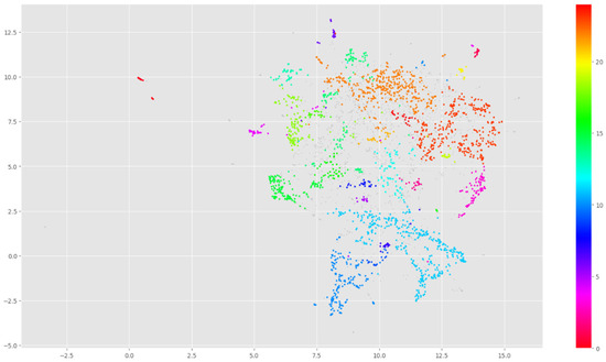 - McInnes, L.; Healy, J.; Melville, J. UMAP: Uniform manifold approximation and projection for dimension reduction. arXiv 2018, arXiv:1802.03426. [Google Scholar]