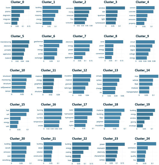 | Cluster 5 | Manufacturing (0.0670892) Electronic (0.0636349) Printable (0.0502373) Application (0.0464119) Material (0.0424274) | INSPIRE—Integrated sustainable production through innovative resource efficiency (UK) Ultralow-cost printed flexible sensors for disruptive IoT applications (Canada) Transition lab-scale production of energy storage devices (US) ULTRA: Ultra-powerful cells for low-emission transport) (UK) |