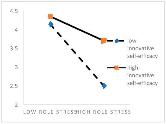 In addition, following Aiken and West [107], we conducted a simple slope analysis to analyze the moderating effect of innovative self-efficacy at different levels. As shown in Figure 2, the negative effect of role stress on innovation performance was weakened under high levels of innovative self-efficacy (simple slope β = −0.396, p < 0.001). Therefore, role stress had a stronger negative effect on innovation performance when employees’ innovative self-efficacy was at a lower level (simple slope β = −0.754, p < 0.001).