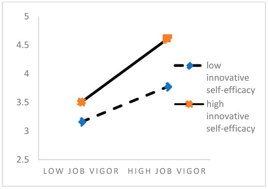 As shown in Figure 3, the positive effect of job vigor on innovation performance was strengthened when employees’ innovative self-efficacy was at a higher level (simple slope β = 0.517, p < 0.001). Meanwhile, job vigor had a weaker positive effect when employees’ innovative self-efficacy was at a lower level (simple slope β = 0.341, p < 0.001).