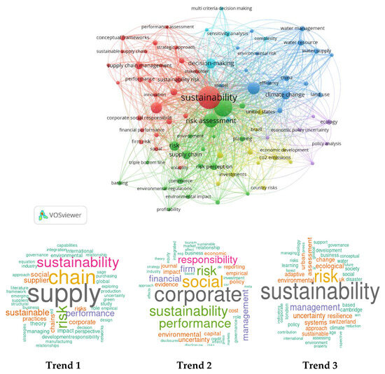 The scientific exploration of publications in Scopus and WoS Databases concerning sustainability, uncertainty, and risk led to identifying three distinct research trends (in line with [9,10]). Figure 2 illustrates the prominent study relationships at the top and showcases the three research trends at the bottom.
