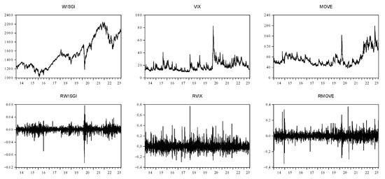 The dataset consists of daily closing prices of Sustainability World Index (W1SGI Index) and two volatility indexes (VIX and MOVE) (Table 1). Our sampling period spans from 1 January 2014 to 12 July 2023, including 2486 daily observations.