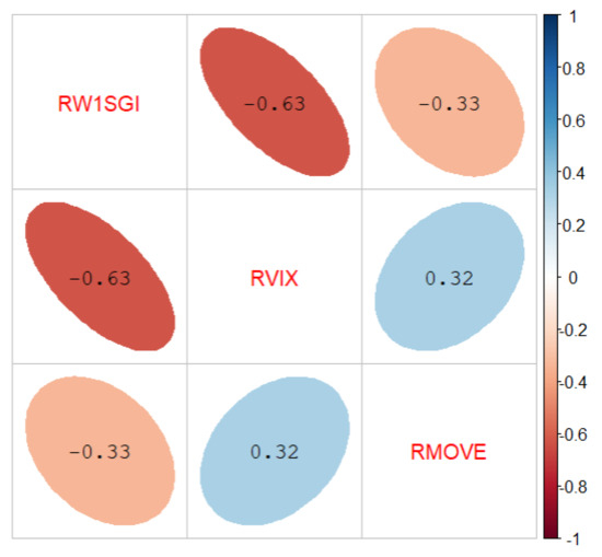 Pairwise correlations across the variables’ returns are presented in Figure 4. The negative correlations between the Sustainability World Index (RW1SGI) and both the ICE BofA MOVE Index (RMOVE) and the Cboe Volatility Index (RVIX), at −33% and −63%, respectively, suggest that as RW1SGI (a sustainability index) decreases, market volatility, as represented by RMOVE and RVIX, tends to increase. These findings could imply that shifts in sustainability perceptions or events might coincide with heightened market volatility. Additionally, the positive correlation of 0.32% between the ICE BofA MOVE Index (RMOVE) and the Cboe Volatility Index (RVIX) suggests that there is a tendency for these two volatility indices to move in the same direction. When RMOVE increases, RVIX also tends to increase, and vice versa. This implies a potential alignment between fixed-income market volatility (RMOVE) and stock market volatility (RVIX). This finding could be useful for investors and analysts in understanding how volatility in different market segments might be interconnected or influenced by similar factors.