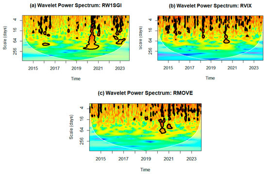 Wavelet power spectrum for DJ Sustainability World Index (RW1SGI), Cboe Volatility Index (RVIX), and ICE BofA MOVE Index (RMOVE). Source: Authors’ own research using data from Bloomberg.
