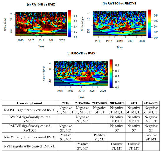 The wavelet coherence approach was employed to examine the causal association between the DJ Sustainability World Index (RW1SGI), the Cboe Volatility Index (RVIX), and the ICE BofA MOVE Index (RMOVE). The findings are presented in Figure 6, showcasing the co-movement of these variables in the time-frequency domain. The figure also includes a table summarizing the main results for each pair of time series. The x-axis depicts the research period in days, while the y-axis illustrates the frequency domain, partitioned into five bands: 1–4, 4–16, 16–64, 64–256, and 256–512 daily cycles. The labels ST, MT, and LT denote short-term, medium-term, and long-term signals, respectively. A color gradient legend on the plot’s right side signifies the power, ranging from dark blue (low power) to dark red (high power).