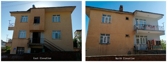 The case study building is a three-story house currently being occupied by nine members of three different families. While the case study building may not perfectly align with the average characteristics (e.g., building type, layout, age, size) of the larger population of houses within Turkey or globally, it holds significant potential for refurbishment opportunities, primarily attributable to its current condition. The house was built around 30 years ago and is located in the eastern part of Turkey, in the Kovancılar district of Elazığ Province, which is associated with cold and harsh winters, as well as hot and dry summers. The house includes three floors with a total area of 254 m2. Each floor consists of an independent residential unit, comprising a living space, three bedrooms, a kitchen, a bathroom, and a WC (Figure 2). The attic is used as storage. The building is oriented in the north–south direction and has four unblocked facades. The transparency ratios of the facades are 15% for the south, 11% for the north, 15% for the east, and 25% for the west (Figure 3). The house has a load-bearing structure. The external walls of the house are made up of bricks with a plaster and paint finish, without thermal insulation. The total thickness of the wall section is 36 cm and the U-value (thermal transmittance) is calculated to be 1.58 W/m2-K. The roof of the house has a timber structure with corrugated iron sheets and there is no thermal insulation and waterproofing in place. Furthermore, the iron sheets are in a deformative state, causing water leakage during rainy weather. The U-value of the roof is computed to be 0.70 W/m2-K. The glazing system consists of double glass on the upper floors and single glass on the ground floor, with U-values of 3.13 W/m2-K and 6.70 W/m2-K, respectively. There is no shading placed outside the window. The list of all the details of the case study building can be seen in Table 1.
