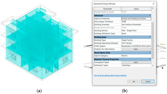 Kim et al. [24] conducted a study on a two-story residential building to investigate the impact of the position and size of windows, as well as the orientation of the building, on the total energy consumption. They developed 65 different scenarios using Revit in conjunction with GBS. Habibi et al. [25] investigated the impact of retrofitting roofing systems on building energy consumption. The proposed roofing alternative consisted of the following layers: photovoltaic panels, an EPDM membrane, and thermal insulation. The results demonstrated an approximately 15% improvement in building energy performance compared to the existing condition. Egwunatum et al. [26] demonstrated that exploiting BIM in conjunction with building energy simulation tools helped them to achieve a multistorey residential building with 103% positive energy. In another study, Abanda and Byers [27] investigated the impact of the building orientation on energy consumption in a three-story house located in the UK using Revit and GBS. The results showed considerable energy cost savings when the building was well oriented. He et al. [28] examined how window retrofitting with 20 glazing alternatives affected the energy performance of a 20-story residential building located in three different climate zones in China using Revit and Design Builder. The results showed that an adequate window system can save a substantial amount of energy. Jeon et al. [29] explored the potential of BIM-based simulations to evaluate the impact of the building envelope on energy consumption. The results demonstrated around a 20% reduction in energy use in a one-story house through the changes applied to the thermal–physical properties of building envelope elements, including the walls, windows, and roof.