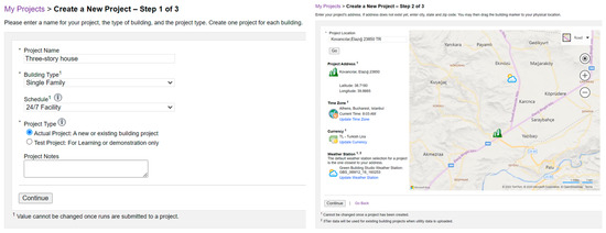 After developing the BIM model(s) in Revit, the energy analytical model(s) of the building was created using advanced energy settings (e.g., building type, building operation schedule, heating, ventilation, and air conditioning (HVAC) system, building service), as shown in in Figure 6. Next, the energy analytical model(s) was exported in gbXML format for energy simulation in GBS. To create a new project in GBS, some details are required to be entered, including the project name, building type, schedule, project type, project location, time zone, and currency (Figure 7). GBS allocates the nearest weather station based on the project location. After the gbXML file(s) was imported, the energy simulation was first conducted for the base case. In order to compare and observe the impact of the retrofit scenarios, simulations were run for each of the 192 scenarios.