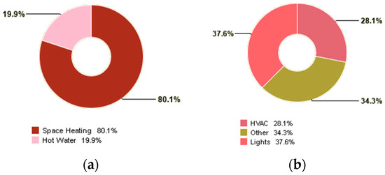 Figure 8 illustrates the distribution of the annual fuel and electricity use of the base run. Heating and hot water account for 80.1% and 19.9% of fuel consumption, respectively. As for electricity, 37.6% is used for lighting, 28.1% for HVAC, and 34.3% for other purposes (cooling, fans, etc.). The annual fuel and electricity consumption are 241,021 MJ and 26,147 kWh, costing 34,210 TL in total (Table 3). Electricity use constitutes around 70% of the annual energy cost.