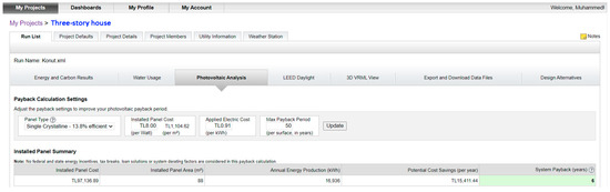 This part presents an analysis of the potential energy savings, costs, and payback period associated with the implementation of photovoltaic panels on the existing building’s roof. GBS’s built-in feature has been utilized as the primary data source to explore the photovoltaic potential of the case study building, as shown in Figure 9. A situation where 88 m2 of single crystalline photovoltaic panels with efficiency of 13.8% are installed on 153 m2 of roof area was designed. The panel cost was determined through thorough market research, yielding a rate of 1 m2 = 1104.62 TL/1 Watt = 8 TL. As a result, the total cost of installing 88 m2 of photovoltaic panels amounts to 97,136.89 TL. The installed photovoltaic panels are projected to produce 16,936 kWh electricity annually. It is estimated that the system will achieve a return on investment within a reasonable period of 6 years. In conclusion, the installation of single crystalline photovoltaic panels with 13.8% efficiency on the existing building’s roof is deemed as the optimal scenario for the retrofit of the case study building, supported by its potential for substantial energy savings and a favorable payback period of 6 years.