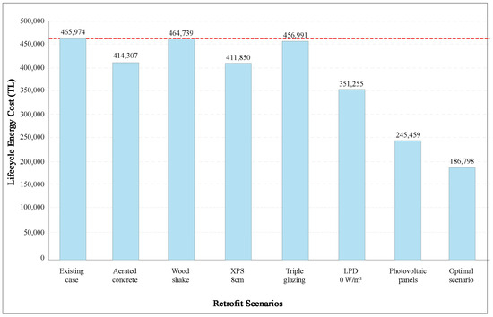 In this section, first, the energy performance of the optimal scenario combining the best-performing retrofitting strategies, namely aerated concrete walls, wood shake roofing, 8 cm XPS insulation, triple window glazing, an LPD of 0 W/m2, and photovoltaic panels, is compared to the existing situation of the case study building. As demonstrated in Table 10, the results of energy performance analysis have indicated that retrofitting existing homes could lead to substantial energy and cost savings. Specifically, the annual fuel consumption witnessed a substantial reduction of 61%, while the electricity consumption achieved an impressive 64% reduction. The existing building’s annual fuel consumption stood at 241,021 MJ, whereas the alternative scenario showcased a remarkable decrease to 92,287 MJ. Likewise, the electricity use for the current building and the alternative scenario amounted to 26,147 kWh and 11,016 kWh, respectively. Moreover, a 59% decrease in both annual and lifecycle energy expenses has been observed. This translates into a significant reduction of 279,176 TL in the building’s lifecycle energy cost. Notably, similar substantial reductions have been observed in energy use intensity and CO2 emissions.