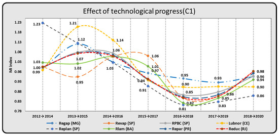 To verify the changes in productivity, a decomposition of the Malmquist index was calculated based on its two effects, matching (catch-up effect) and technological progress (frontier shift effect), besides the general Malmquist index, which allows for an analysis of total factor productivity [17]. The data referring to the pairing effect are presented in Table 5. A significant variation can be seen in the results presented. If the pairing results in an index greater than 1, it means that technical efficiency increased in period t + 1 in relation to period t. If this index is equal to 1, technical efficiency remained the same, and if it is less than 1, it worsened [28,38]. This index was equal to 1 in the case of Recap (SP), Revap (SP), Lubnor (CE), and Replan (SP) refineries, all belonging to the first cluster, which shows that there were no significant changes in their technical efficiency during the period.