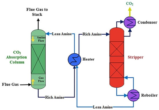 Basic flowsheet of the monoethanolamine CO2 capture process. Reproduced with permission from Aghel et al. [16], International Journal of Greenhouse Gas Control; published by Elsevier in 2022.
