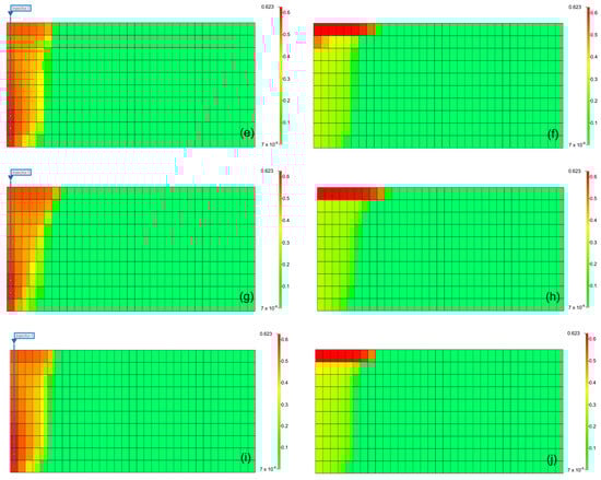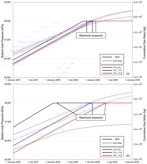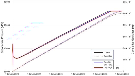 Figure 5 shows the BHP (solid line) and cumulative gas mass (dotted line) over the 10-year period of CO2 injection. When CO2 is injected into the saline formation, the injection fluid is momentarily compressed near the injection well to displace the formation water, causing a rapid increase in the BHP. The increased pressure then decreases as CO2 flows and subsequently increases linearly with increasing injection rate. The BHP exhibited a constant trend after reaching a maximum pressure of 38,000 kPa, with the timing varying depending on the presence and concentration of impurities. The sequence of BHP reaching the maximum pressure was methane, pure CO2, and H2S. The cumulative gas mass increased linearly until BHP reached the maximum pressure, and the injected gas mass followed the order of pure CO2–H2S–methane. After the BHP reached its maximum pressure, the cumulative gas mass decreased gradually. Additionally, comparing the overall changes in BHP and the trends in cumulative gas mass between cases with impurity concentrations of 3.5% (Figure 5a) and 20% (Figure 5b), the difference caused by the impurities became more pronounced as concentration increased.