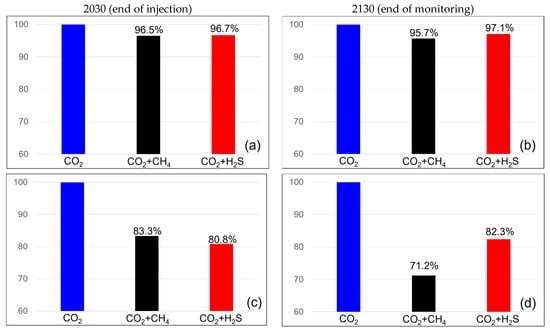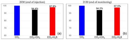 The difference in CO2 injection efficiency owing to impurities during the last 3 years before the end of the injection is described in Table 7. Two years before the end of the injection, on 1 January 2028, when the impurity concentration was 3.5%, the CO2 injection efficiency was 96.5% regardless of the type of impurity. However, when the impurity concentration was set to 20%, including methane, it resulted in an efficiency of 79.7%, and including H2S, it resulted in an efficiency of 80.8%, showing a difference of within 1% compared with the CO2 injection efficiency without impurities. One year before the end of the injection (1 January 2029), the BHP reached the maximum pressure when injecting pure CO2. However, when injecting CO2 mixed with methane, the BHP reached the maximum pressure earlier, resulting in reduced injection rates. Consequently, when the methane content was 3.5%, the CO2 injection efficiency decreased to 96.1%, and when 20% methane was present, it decreased further to 76.2%. However, the CO2 injection efficiency with H2S as an impurity showed no significant change compared with that of the previous year. In 2030, when methane was present, the injection efficiency of pure CO2 showed a gradual decline, with an efficiency of 95.4% at a 3.5% methane concentration and an efficiency of 73.16% at a 20% methane concentration. When H2S was present as an impurity, BHP reached its maximum pressure between 2029 and 2030, after which the injection rate began to decrease. As a result, at the end of the injection period, when the H2S concentration was 3.5%, the CO2 injection efficiency increased to 96.91% compared with that of pure CO2 and 81.99% when the concentration was 20%. Therefore, before reaching the maximum BHP pressure, the designed impurities were injected; however, after reaching that point, the storage efficiency varied based on the properties of the impurities.