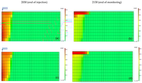 Differences in solubility trapping efficiency between the end of the injection (left) and monitoring (right) with impurities ((a,b) contains 3.5% impurity, (c,d) contains 20% impurity).