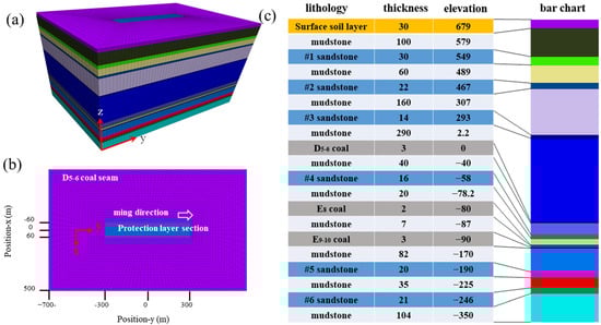 Based on the Mohr–Coulomb failure criterion, the numerical calculation model is established by using FLAC3D software and combining it with the rock column diagram of the No. 204 section in the E9–10 coal seam of the Pingdingshan No. 8 Mine (Figure 1). The relevant rock mass mechanical parameters of the model are listed in Table 1. The D5–6 coal seam is a near-horizontal coal seam. It is assumed that the coal seam dip angle is 0° in the calculation, and the coal seam floor is taken as the 0-point elevation of the model. The top elevation of the model is 679 m, and the bottom elevation is −350 m. The total width of the model along the X-direction is 1000 m, and the total length along the Y-direction is 1400 m. The protective seam section located in the D5–6 coal seam is 600 m long along the Y-direction. The width of the cut–hole along the X-direction is 120 m. The center point of the model is located in the center of the protective seam section, and the section is mined from −300 m to 300 m along the Y-direction, with a cumulative mining length of 600 m. In the numerical model, the rock surrounding the section of the protective seam is large enough to significantly reduce the boundary effect.