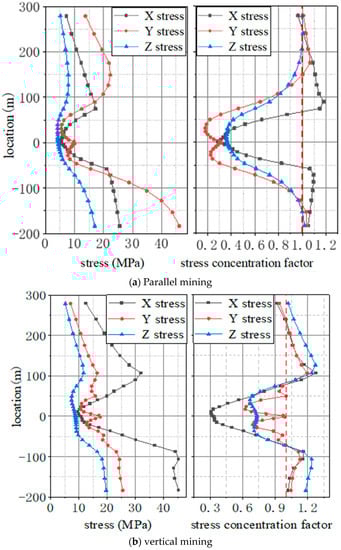 As shown in Table 4, the pressure relief range of stress in the X-direction in vertical mining is greater than that in parallel mining, and the pressure relief range of stress in the X-direction is −75–80 m. In parallel mining, the unloading range of stress in the Y- and Z-directions is greater than that of vertical mining, and the unloading range of the Y-direction stress reaches −130–148 m, greatly increasing the unloading range.