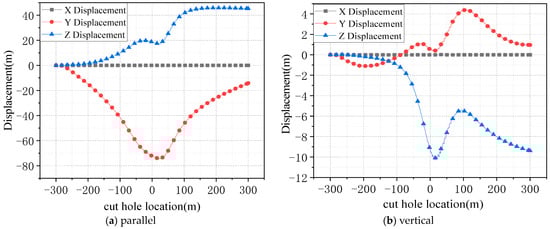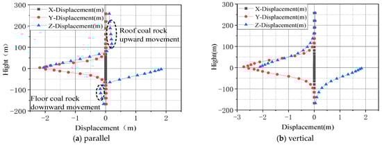 Compared with Figure 4, regardless of parallel or vertical mining, the X displacement changes are small, which can be ignored compared with the Y and Z displacement changes. The Y displacement is mainly negative, which indicates that the surrounding rock above and below moves toward the depth of the goaf after the mining of the protective seam section, but the Y displacement in parallel mining is larger than that in vertical mining. The Y displacement of coal is larger in the range of −100 to 100 m in parallel mining, while the displacement of the rock mass is larger only in the range of −75 to 75 m in vertical mining. The larger the Z displacement of the surrounding rock is, the greater the difference is: in parallel mining, the upper rock mass moves downwards, while the lower rock mass moves upwards. However, during vertical mining, the rock mass at −75 m below moves downwards, while the coal mass at 75 m above moves upwards. Such rock mass movement inevitably forces the rock masses to squeeze together, resulting in greater stress concentration, which is not conducive to increasing the pressure relief range. The conclusions of this part are mutually verified with those of the stress distribution in Section 3.2.