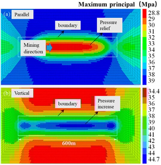 Comparison of the maximum principal stress distribution of the protective seam. (a) parallel mining; (b) vertical mining.