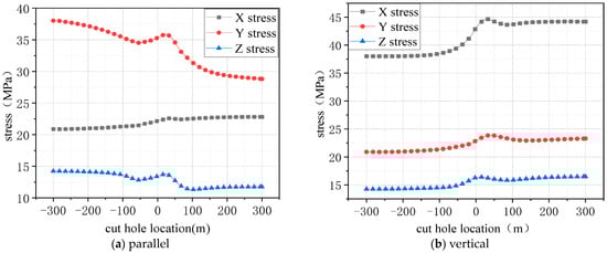 In the process of mining the protective seam, the stress of the surrounding rock changes dynamically. Figure 6 shows the three-dimensional stress evolutionary law in the protective seam immediately below the center of the protective seam section under the parallel and vertical mining schemes. The measurement point is 88 m away from the vertical distance of the protective seam. The horizontal coordinate in Figure 6 indicates the position of the cut–hole during the mining of the protective seam section: when the cut–hole is located at −300 m, the measuring point is at 300 m above the cut–hole; when the cut–hole is located at 0 m, the cut–hole is directly above the measuring point. When the incision is at 300 m, the measuring point is 300 m behind the incision.