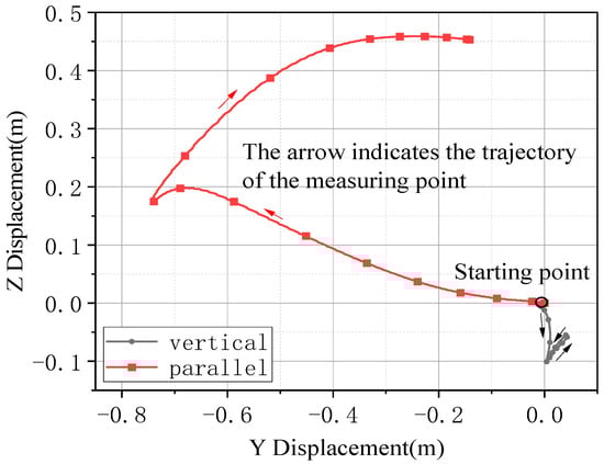 To clarify the law of motion of measuring points under two mining schemes, motion trajectories of measuring points under two vertical and parallel mining schemes are drawn, as shown in Figure 8. Because the X displacement of the measuring point is small, the motion trajectory of the measuring point on the YZ plane is mainly drawn.