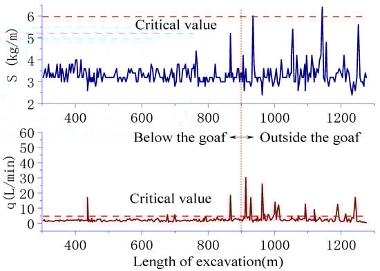 In the driving process of the #204 inlet roadway, the cutting amount, S value, and initial gas release velocity q of the borehole were continuously tested, as shown in Figure 10.